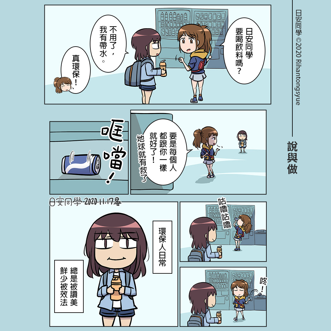 每次畫環保題材都膽戰心驚,台詞或情境設計得很謹慎,透過漫畫分享自己的日常,傳達環保可以是一種自由的生活方式、每個小小的選擇,實在沒有想強迫誰,但還是會有人會質疑或挑戰我(而且這些人往往是第一次看我的作品就罵,或平常根本沒在關注環保只是想攻擊我的人),老實說真的很累,還是直接畫一堆百合廢萌就好了((欸