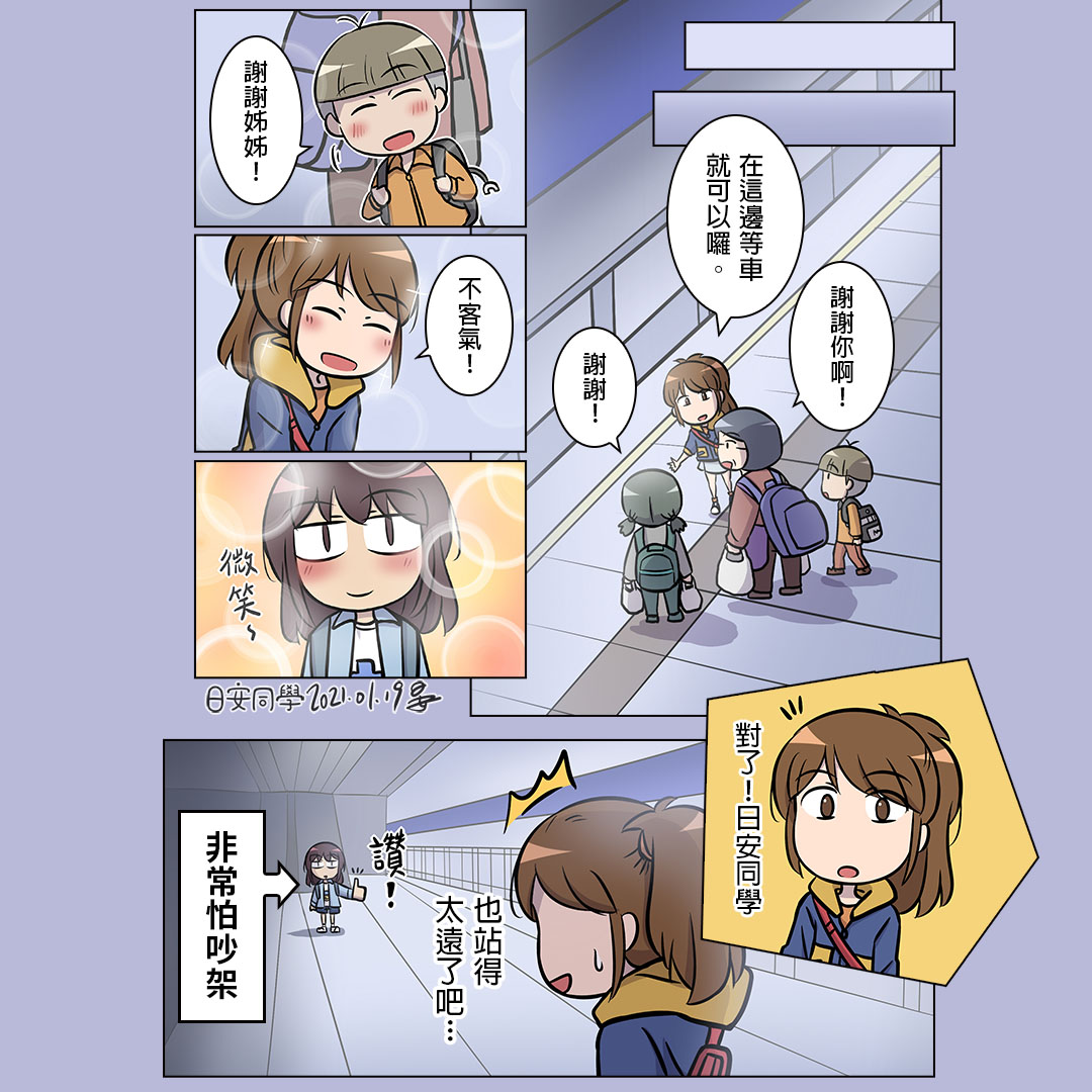 【日安同學漫畫】路上的天使2022 年 11 月 5 日日安同學系列 【日安同學漫畫】路上的天使 感謝生活中每一位默默行善的天使。 閒聊:我容易受強烈情緒感染,所以無法看恐怖電影。 2021 / 01 / 26 by日安同學 我是日安同學,喜歡我的漫畫歡迎點讚或留言喔,你的支持是我創作的動力! 謝謝你的觀賞,下次見。 標籤# Q版# 助人# 原創# 可愛# 台灣# 圖文# 女孩# 席波# 日安同學# 日安同學系列# 日常# 有趣# 朋友# 治癒# 溫馨# 漫畫# 生活 上一 文章 【韓劇】《社內相親》漫畫版《我和社長相親相愛》和天菜談浪漫愛情!A Business Proposal 下一 文章 【日安同學漫畫】說與做