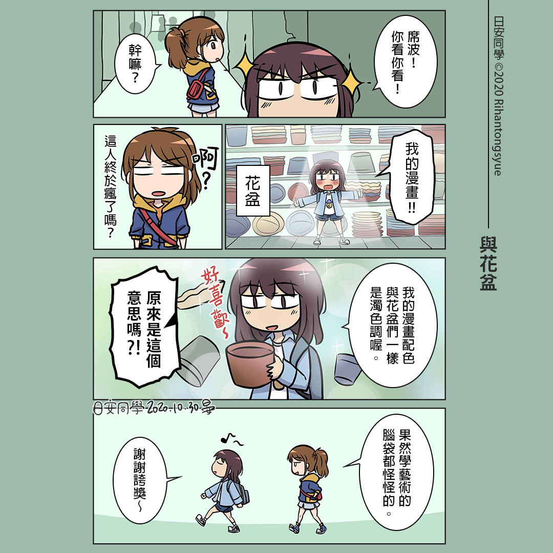 【日安同學漫畫】與花盆2022 年 6 月 18 日日安同學系列 【日安同學漫畫】與花盆 濁色調(低彩度)是日安同學漫畫的主要配色。 中庸、安定、柔和, 是我希望日安同學給人的感覺。 濁也有不純、髒的意思, 我認為人生沒有非黑即白, 儘管說我怪也好、不上進也好, 舒適自在便行, 日日好日,安然自得。 2020 / 10 / 30 by日安同學 把日安同學系列的漫畫背景色票整理起來頗壯觀的XD 喜歡我的漫畫歡迎留言互動,你的支持是我創作的動力! 謝謝你的觀賞,下次見。 facebook IG 巴哈姆特 twitter line貼圖 標籤# Q版# 原創# 可愛# 台灣# 圖文# 席波# 搞笑# 日安同學# 日安同學系列# 日常# 有趣# 治癒# 溫馨# 漫畫# 生活# 花盆 上一 文章 【英文語錄】40句 經典英文諺語:人生不在活得長久,而在活得精彩 下一 文章 電影【朵貝的愛情繪本】暢銷全球嚕嚕米作者傳記電影:導演、演員、預告片 Tove