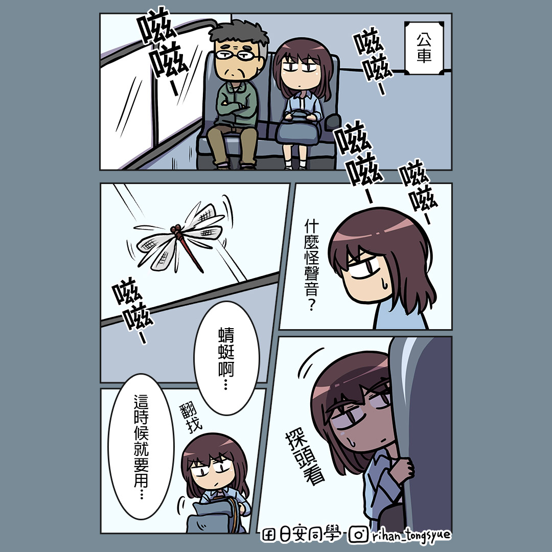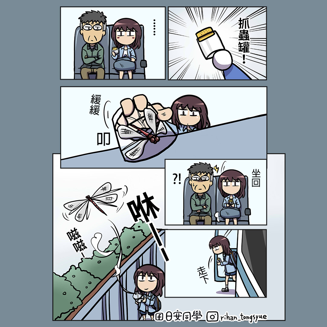 蜻蜓的翅膀很強壯,拍打聲非常響亮,起初還以為是引擎出了問題。抓蟲的技巧是「輕且慢」地把罐子蓋上,過於用力可能會嚇到或傷到昆蟲,接著趁昆蟲往罐子內部移動時,迅速封住罐口。如果昆蟲剛好位於難以觸及的地方,絕對不要勉強去抓,能不能抓到都是靠緣分,安全最重要喔(認真)